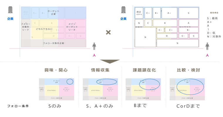 顧客を購買プロセスにおけるステージで区分し、フォローの優先順位づけを行うとこのような図になります。