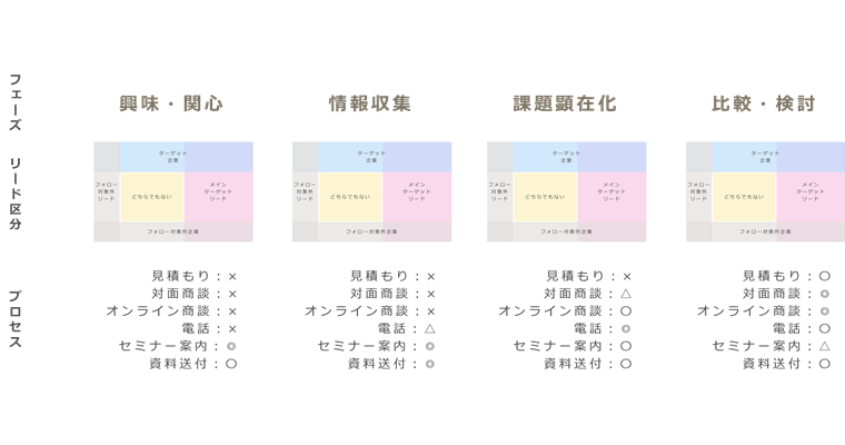 例えば、興味・関心段階であれば商談ではなくセミナーの案内や資料送付をすべきですし、課題が顕在化している段階であれば電話でのコミュニケーションがベストかもしれません。