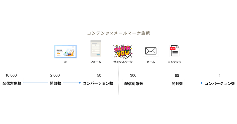 例えば、対象を絞らないで10,000件のメールを配信したら50コンバージョンが取れるような場合でも、ターゲット企業のターゲットリードにだけ絞って配信するとなると、配信対象数が300とぐっと減りますので、コンバージョン数も1あるかないかという状況が考えられます。