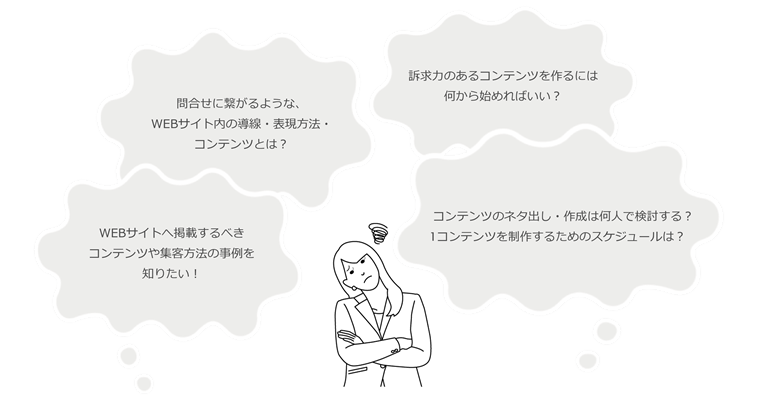 コンテンツはWebマーケティング最大のポイントですが、いざ作るとなると悩みが多いもの。よくある悩みをいくつか挙げてみると・・・
