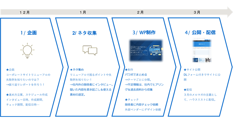 「サイトリニューアルを控えているお客様は、失敗例を知りたいと考えているだろう。だから、失敗例と失敗しないポイントについて解説するホワイトペーパーを作ろう」と企画し、まずは社内の関係者にインタビューをしてネタを収集します。その後、資料の構成を固め、作り込んでいきます。