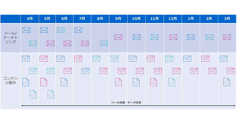当社では現在、メルマガは月1本、コンテンツ制作は月2本以上コラムを制作、ホワイトペーパーは2ヶ月に1本以上の公開を基準に計画しています。
