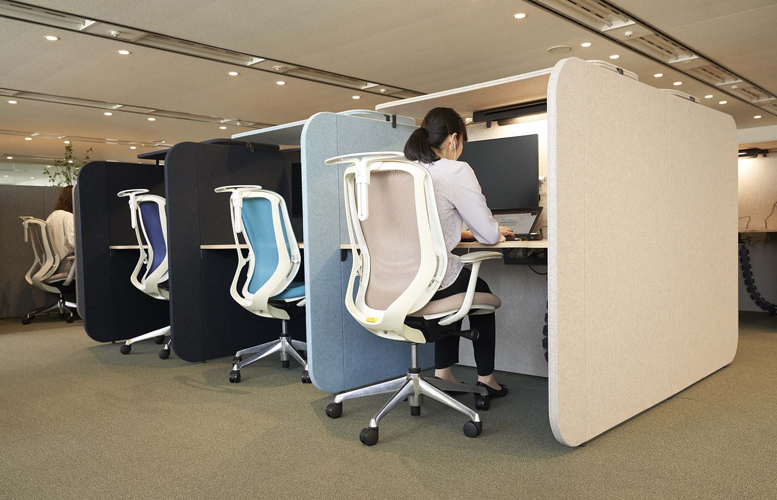 High Focus エリアでは、集中しやすい環境とは何かを考え、照明、配色、音を考えられた空間になっています。温かみのある照明と異なるアースカラーの家具、景色の良い席などを設置。またサウンドマスキングを導入し、周囲の会話や音に配慮した環境となっています。
