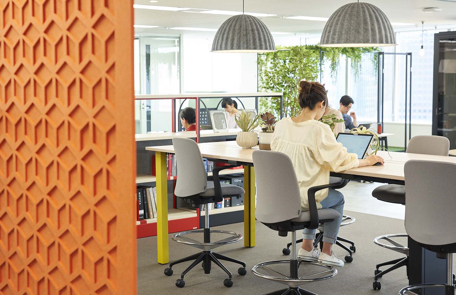 オフィスは社内のチームワーク強化の上で重要なスポットです。テレワークだけでは成しえない、クオリティーの高い成果を生みだすことができるよう、ミーティングの内容に合わせて空間や家具、ツールを自由に変えられるアジャイルな空間となっています。