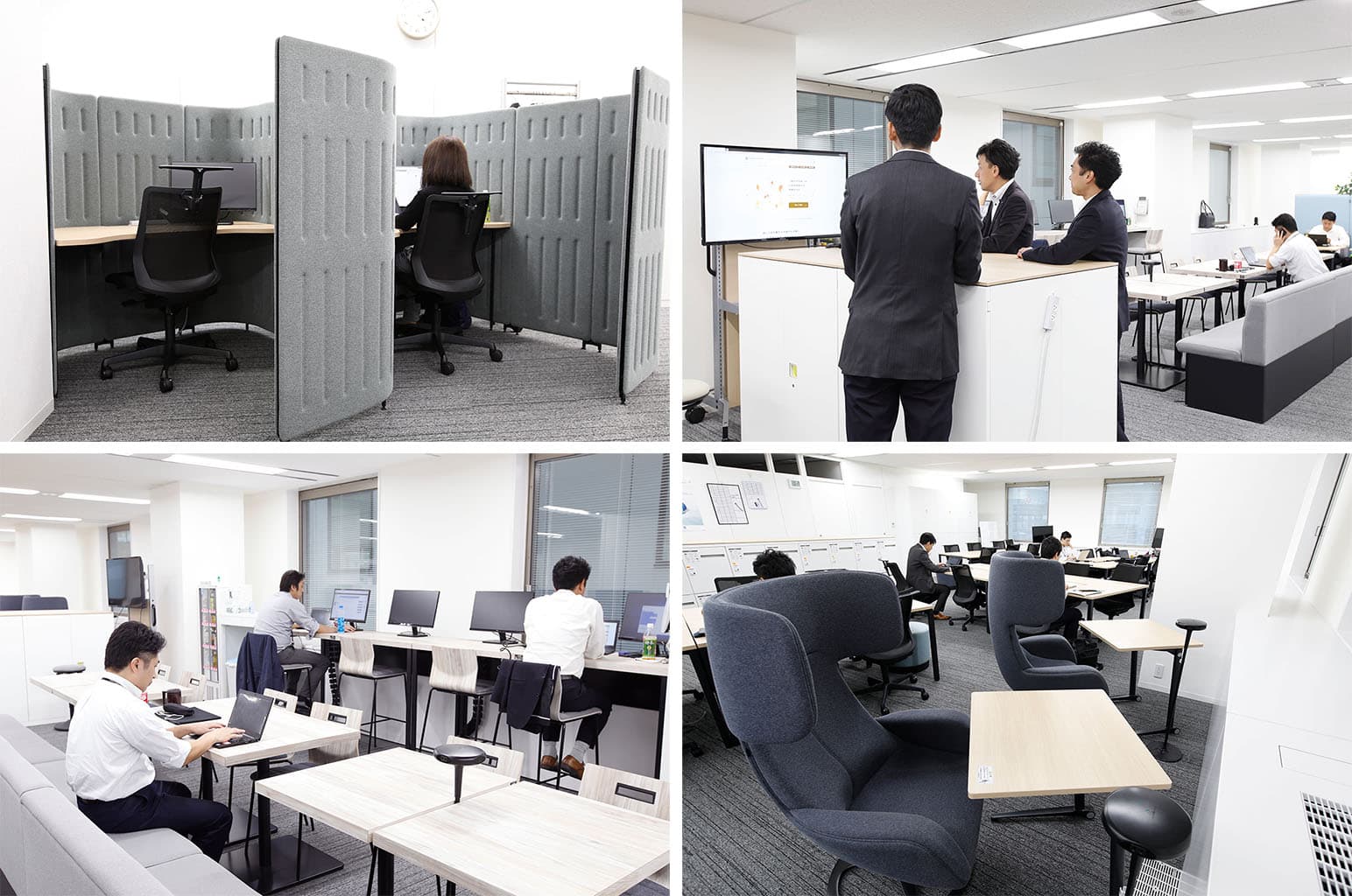 フリーアドレスの執務室には、多様な働き方ができるよう、バラエティーに富んだワークスペースを配置。集中して作業ができる「集中ブース」、必要な時にパッと集まって、立ちながらミーティングができる「ハイカウンター」、リラックスして作業に望める「カフェソファー」や「パーソナルソファー」などを用意しています。