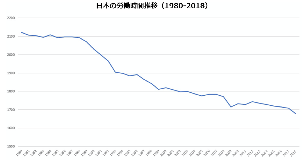 さらに、日本単独の労働時間推移データを見ると、1980年代の2,100時間台から、2000年代から2010年代の1,700時間台へ一貫して減少傾向にあります。大きな契機となったのは1988年の改正労働基準法の施行です。