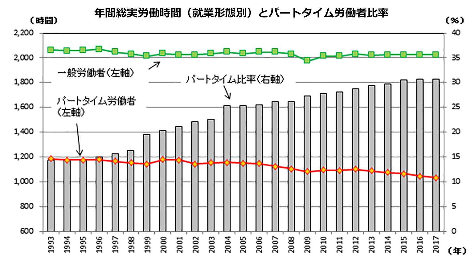 さらにグラフのオレンジの線に見られるように、パートタイム労働者の労働時間は2000年代後半から短くなる傾向にあり、全体の労働時間を押し下げる要因となっています。