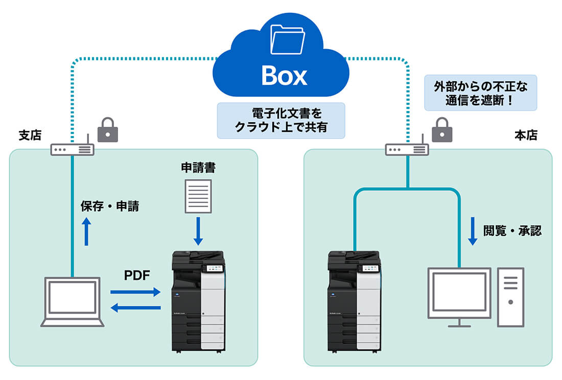 「クラウド活用拠点間業務連携システムパック」では、セキュリティー対策を講じ、あんしんのクラウドサービスを活用し、支店・本社それぞれで紙と電子データを行き来できる環境を実現いたします。