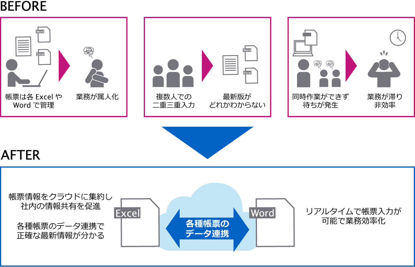 「文書のローカル重複管理脱却パック」では、従来のExcelやWordを使った帳票管理をクラウド上に構築したシステムに切り替えることで、作業時間の短縮や情報促進など業務効率化を実現します。また、各帳票のデータ連携を行うことで、不必要な重複入力をなくし、最新の情報にアクセスすることが可能になります。