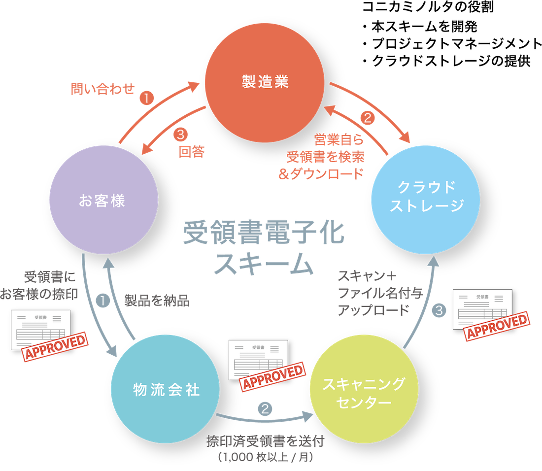 コニカミノルタの「ドキュメントソリューション」は、自社実践を通じて培ったノウハウを活かし、お客様のオフィスの文書管理をご支援するサービスです。お客様とのコミュニケーションを通して現状の業務における課題を明確にし、現場にて実行可能な運用体系のご提案と、それに即した紙文書電子化スキームを開発し、ご提供するとともに、お客様にて個別の閲覧権限の設定・管理が可能なクラウドストレージを併せてご提供いたします。これにより、社内の紙文書保管スペースの削減にとどまらず、電子化した文書の良好な検索性も確保し、業務の効率化を推進いたします。