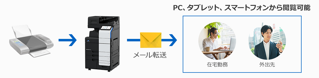 受信したファクスを、あらかじめ設定しておいたメールアドレスへ転送できるため、外出先でも、モバイル端末で受信ファクスを確認することができます。