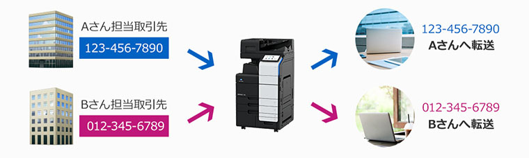 各取引先からのファクスを担当営業宛に振り分けて転送することができるため、効率的にファクス確認を実現できます。
