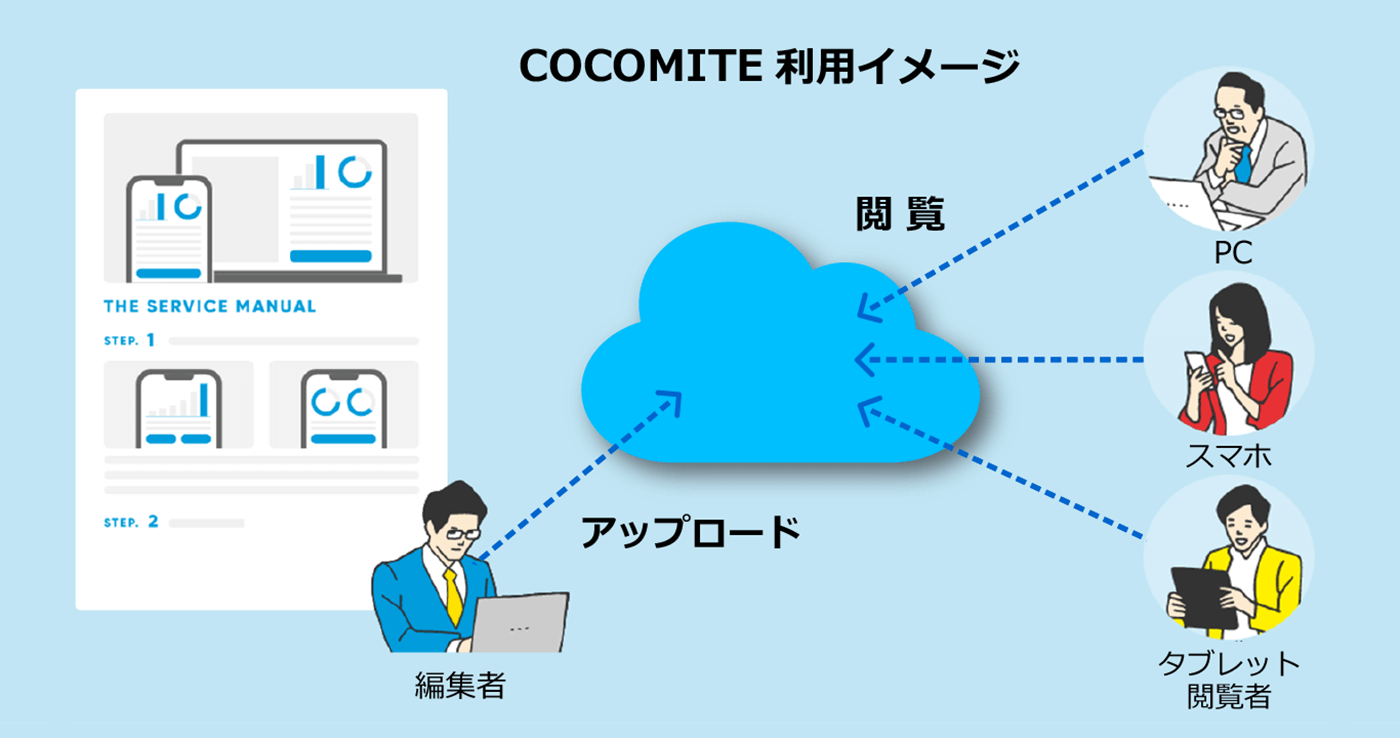 コニカミノルタが提供するCOCOMITE(ココミテ)は、オンラインでマニュアルを作成・閲覧・運用できるサービスです。Webブラウザー上に表示される基本レイアウトに沿って入力していくだけで、画像や動画が入った分かりやすいマニュアルが誰にでも作成可能です。また、導入から運用・管理までをフェーズに合わせた料金で利用できるため、ユーザー数に合わせた無駄のない導入が可能です。これにより社内の熟練者が持つナレッジが分かりやすく多様な観点で共有できるため、人材育成やナレッジの共有を効果的に行うことが可能となり、研修生の習得のバラツキを減らした上でスピードアップを図ることができ、生産性とサービスの質の向上に貢献いたします。