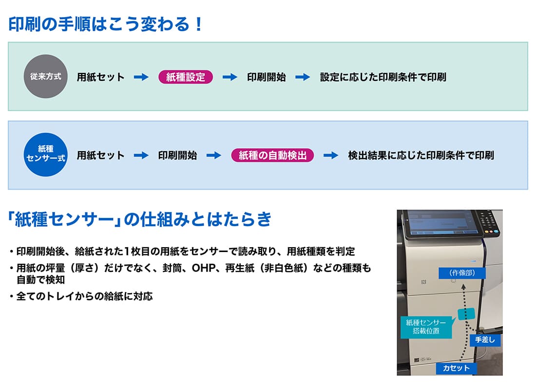 用紙の厚みと種類を自動判定できる紙種センサーをコニカミノルタの複合機に搭載。用紙をセットするだけで、紙種センサーが用紙種類を判定し設定を自動的に調整できます。