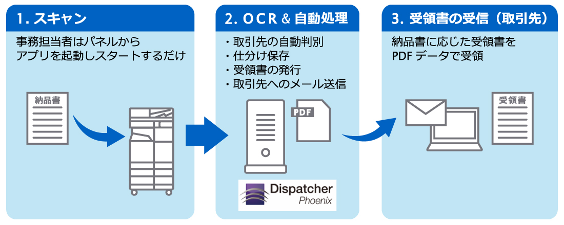 「Dispatcher Phoenix」はコニカミノルタ独自開発によるドキュメントワークフロー自動化ソリューションです。スキャンした紙画像に対し、OCR機能で納品書から特定情報を読み取りフォルダーに仕分け保存すると同時に、台帳から取引先に対応するメールアドレスを参照し、納品書情報をもとに作成した受領書を送信するまでの工程の自動化を実現。