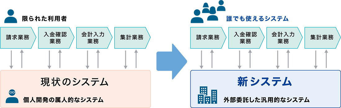 1. 汎用ソフトを使った手作りシステムのため、業務対応とメンテナンスが属人化している
