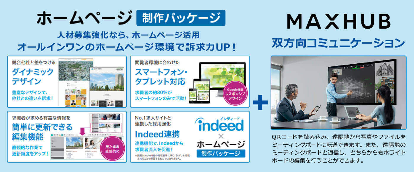 コニカミノルタでは人材確保に貢献する「ホームページ制作パッケージ」、リモートでの社員教育に有効な「HAXHUB」をご用意しています。求職者は、「会社の雰囲気や社風」、「自分が実現したい働き方とあっているか」などを重要な情報源としているため、ホームページによる情報発信や募集要項がすぐに確認できることは重要です。また、確保した人材はしっかりとした教育を行うことで会社への定着および貢献が可能になるため、社員教育の環境構築は重要です。