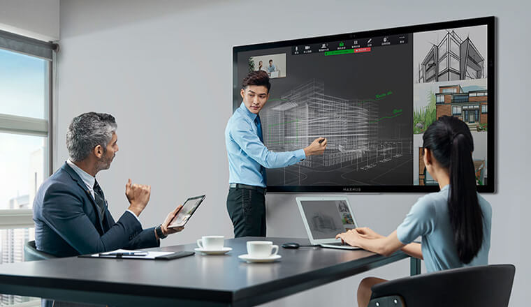 大型タッチパネルモニターに高品質なカメラ、マイク、スピーカー、PCなど会議に必要な機能を全て搭載しています。