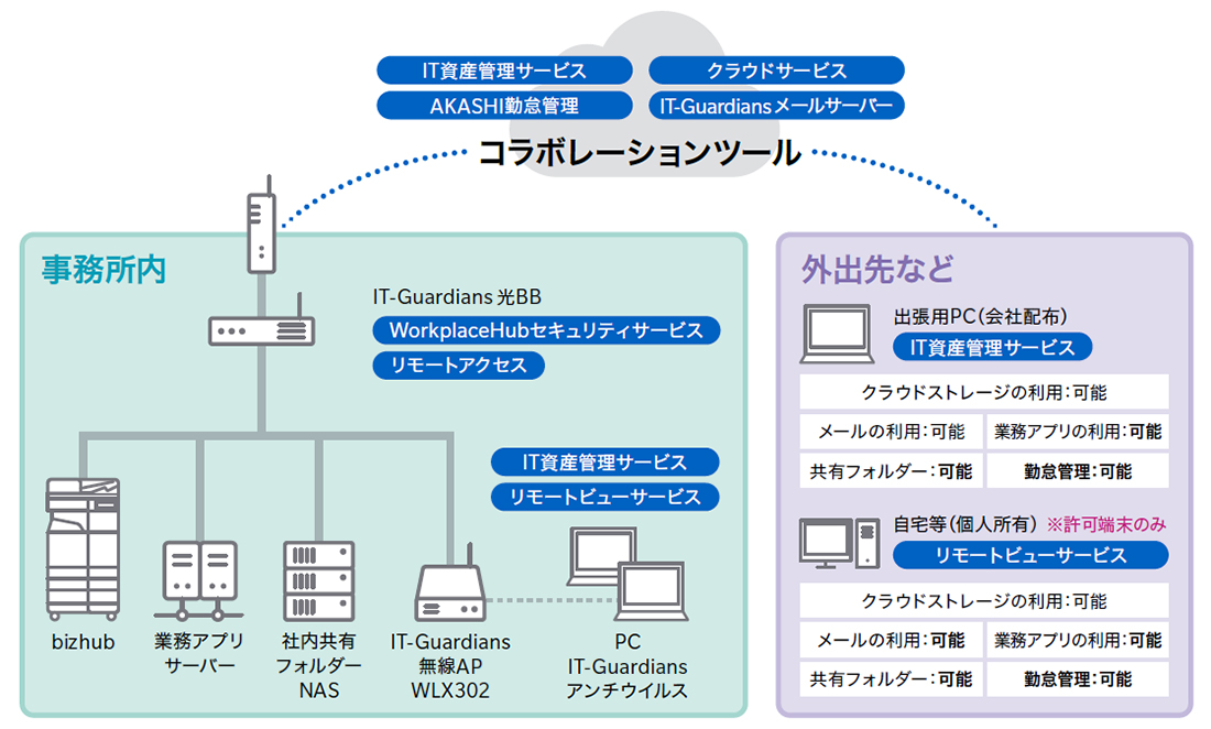 まずは「Workplace Hub」のセキュアなVPNサービスにより、テレワークでも社内のインフラにアクセスできる環境を構築。その後、ドキュメント管理やメールサーバーなどをクラウドサービスに移行し、コミュニケーションツールを導入。