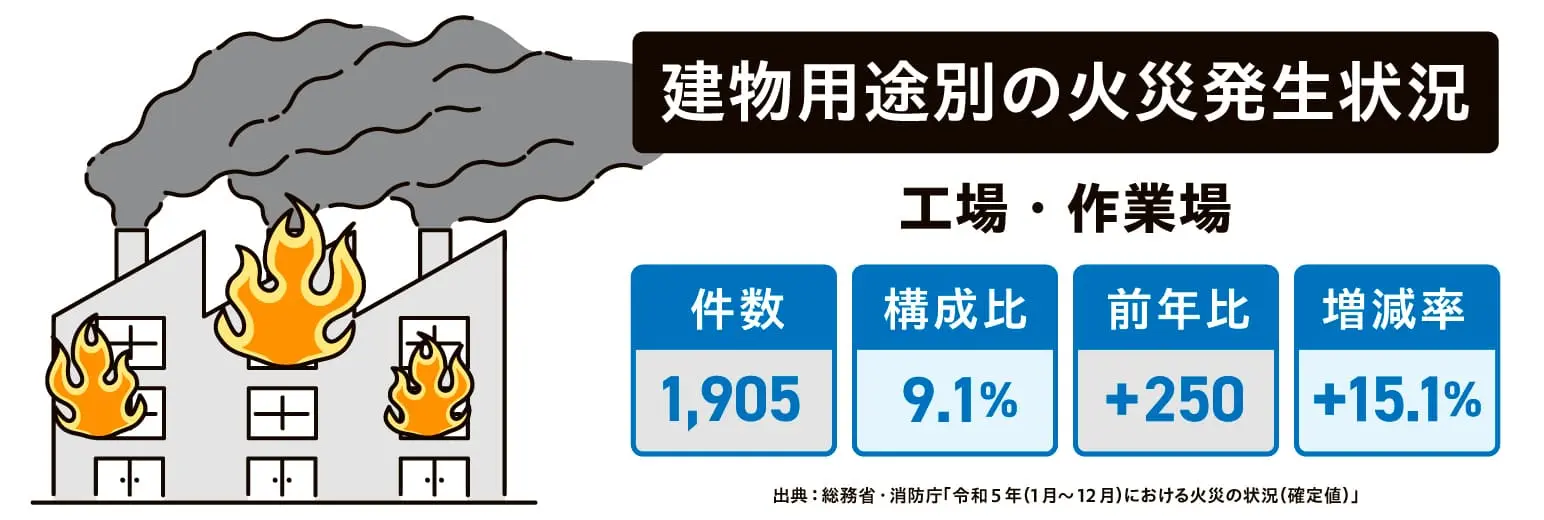 製造業の現場では、火災は突発的に発生するものではなく、多くの場合、温度の上昇や異常な臭い、発煙といった前兆が存在します。しかし、これらの兆候に気づかず初期対応が遅れると、重大な事故につながりかねません。令和5年の総務省消防庁の統計によれば、全国で38,659件の火災が発生しており、なかでも製造業を中心とした工場・作業場での火災件数は高止まりしています。火災による被害は、人的損害や設備損壊だけでなく、事業の長期停止やブランドイメージの毀損にもつながり、企業活動に与える影響は計り知れません。