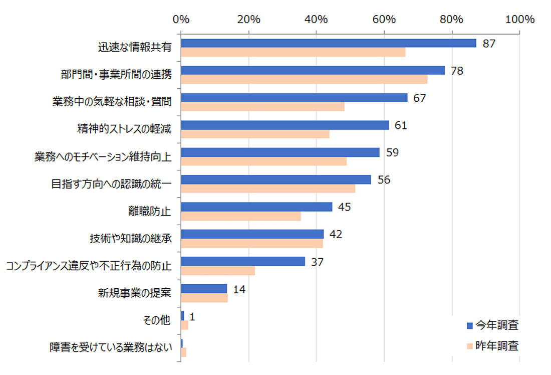 最も多いのは「迅速な情報共有」で87%、次いで「部門間・事業所間の連携」が78%、「業務中の気軽な相談・質問」が67%などとなっており、上位7項目は2020年調査より業務障害として挙げる企業の割合が増加している(図表2)。特に「迅速な情報共有」と「業務中の気軽な相談・質問」は、2020年調査より20ポイント以上増加しており、これまでより社内コミュニケーション不足による障害を強く意識されている傾向が伺えます。