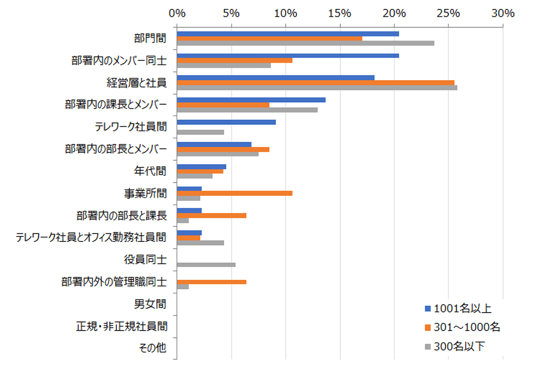 次に、「社内コミュニケーションに最も課題を感じる関係間」を見てみると、大企業では「部門間」と「部署内のメンバー同士」がもっとも多く20%となっており、中堅・中小企業では「経営層と社員」が最も多く、ともに26%となっています(図表4-1)。