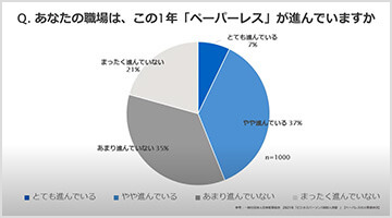 一般社団法人 日本能率協会の2021年の「ビジネスパーソン1000人調査」によると、「職場におけるペーパーレスにメリットを感じているか?」という質問に対しては、全体の約8割の企業が「メリットを感じている」と答える一方、社内のペーパーレスが「とても進んでいる」あるいは「やや進んでいる」と答えた企業は約4割にとどまり、半数以上が「あまり進んでいない」「まったく進んでいない」となりました。つまり多くの方々がペーパーレスにメリットや魅力を感じていながらも、多数の企業がまだ満足に導入できていないという実態があるようです。