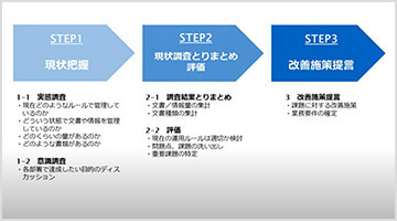 現存する業務文書の流通量や保管量の集計と、それらの運用ルールを評価し、問題点や重要課題を特定していきます。