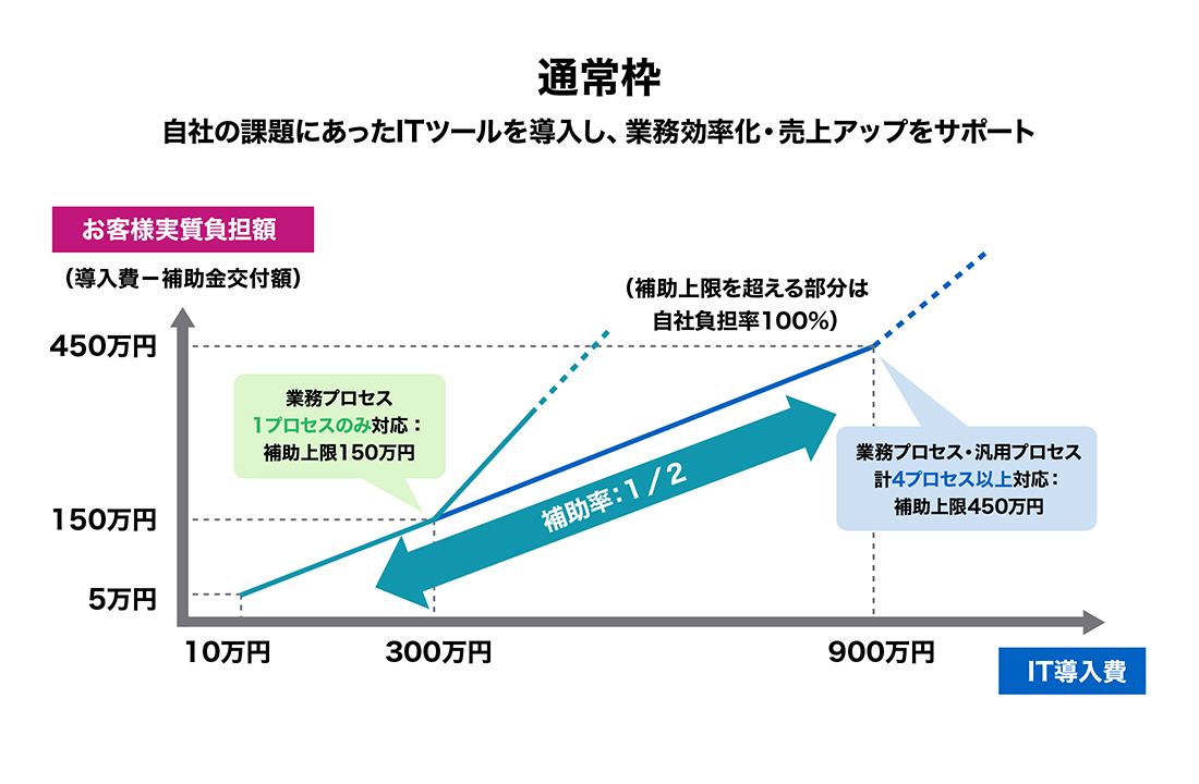 いずれもIT導入費に応じた補助率にて補助金が交付されるため、お客様の実質負担額はIT導入にかかる実費から補助金額を差し引いた額に抑えることができます。