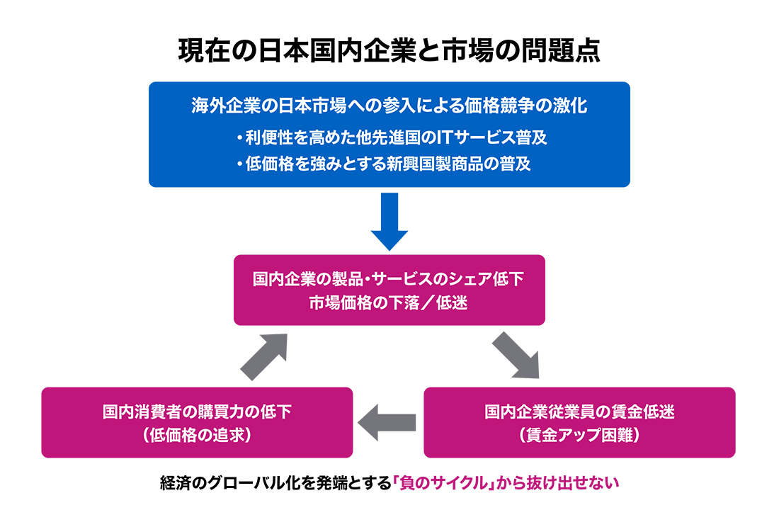 国内の多くの中小企業が持ち合わせている底力(技術力、サービス能力)は元来強く、先進諸国含めた他国よりも優位な産業が数多く存在します。しかしながら近年は経済のグローバル化の流れを受け、国内市場にも低価格戦略で参入してくる海外企業との競争が激化。国内企業は従業員の賃金が上げられない状況にあり、多くの消費者の購買力が上がらず、より低価格なものが求められ続けるという「負のサイクル」が慢性化しています。