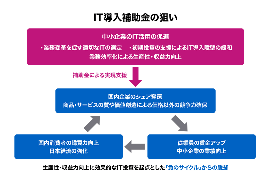 「IT導入補助金」はそのような国内企業の課題を解決に導くための政策の一つと考えます。中小企業や小規模事業者が「IT支援事業者」とパートナーシップを組んで適切なITを選定し、導入したIT投資に国が費用を負担するという、とても合理的で効果的な政策と考えられます。