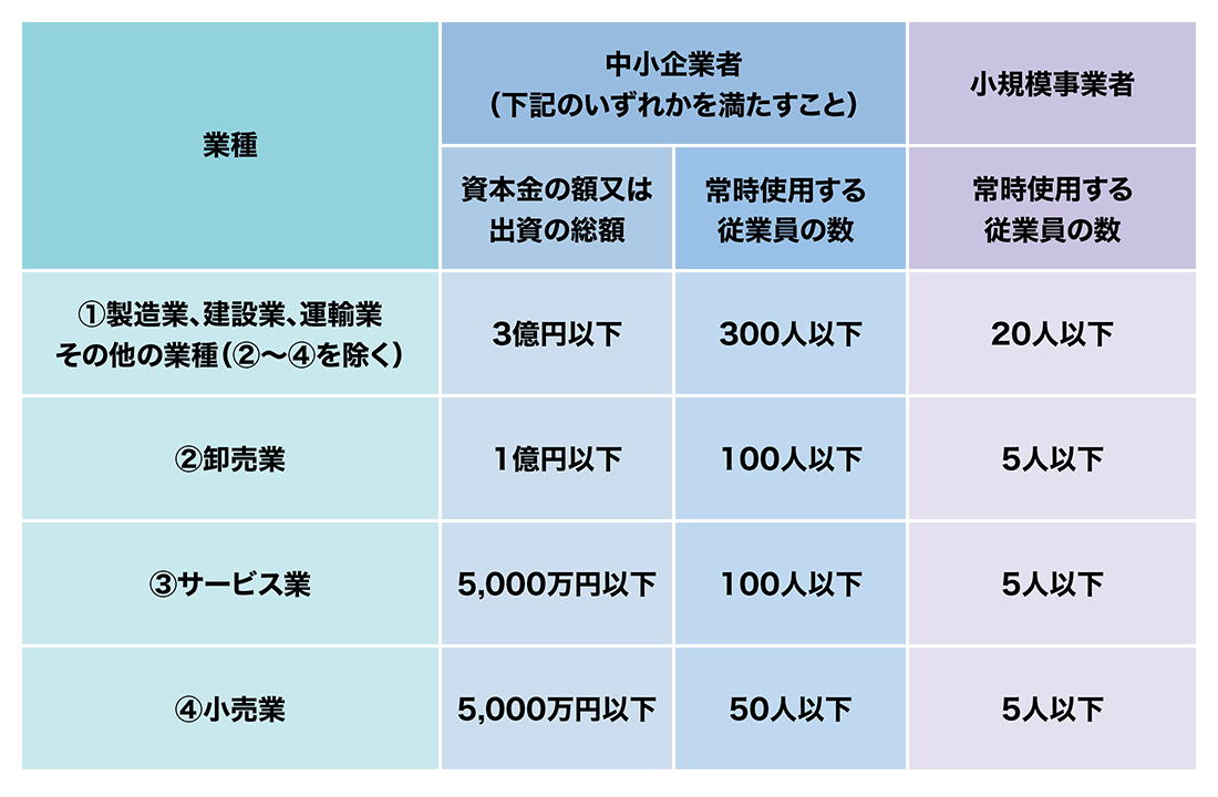 補助金を受ける事業者(補助事業者)が、中小企業または小規模事業者であることが必要です。中小企業や小規模事業者は資本金と従業員数によりますが、中小企業は業種によりその基準が異なります。