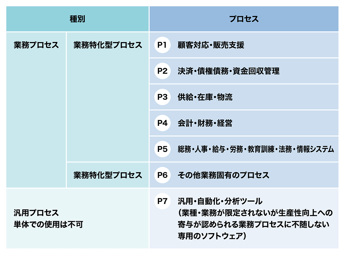 通常枠の場合、導入ITは下表のP1からP7までの「業務プロセス」と呼ばれる業務の電子化や効率化にかかわる解決手段でなければいけません。P7の「汎用プロセス」は、通常枠にて他のP1~P6と組み合わせて申請する必要があります。