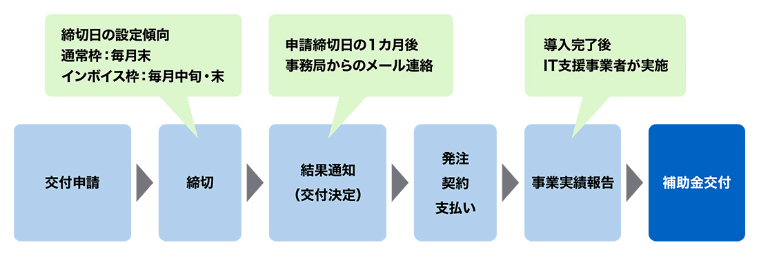 通常、2か月以上先の締め切り日は未発表ですが、通常枠は毎月末、インボイス枠は月の中旬と月末に設定される傾向にあります。目前に迫る締切日に慌てて駆け込み申請すると、思わぬ記入ミスや不備で不採択となる可能性が高まります。自社に合った継続運用可能なITツールを見極め、申請内容をしっかりと確認し、余裕をもって申請するようにしてください。