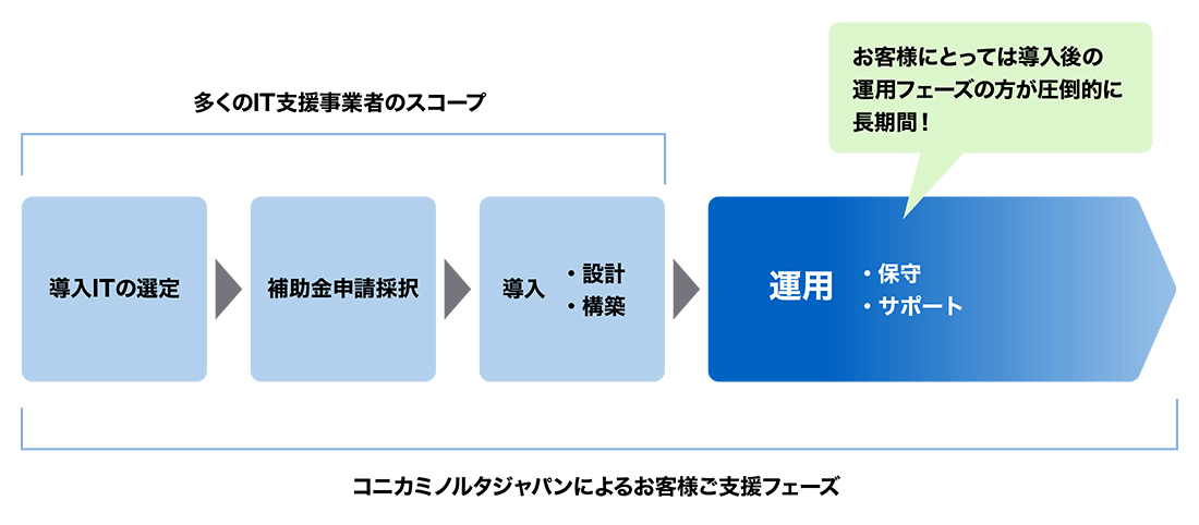 コニカミノルタジャパンは単なるITツールの販売者に留まらず、全国のお客様のIT導入の設計、構築、運用、保守をトータルでご支援させていただいている実績があります。お客様の中には一度IT導入補助金を獲得された後、さらなる業務効率化や収益力向上を目指した追加のIT導入で再度補助金を獲得される“リピーター”も存在します。