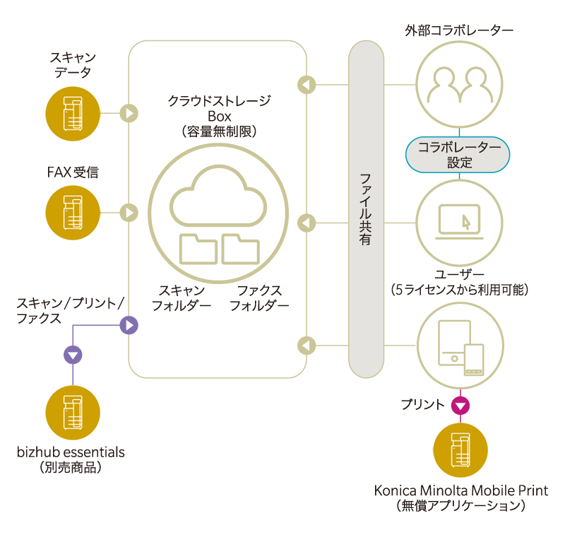 コニカミノルタの「bizhub i シリーズ」では、スキャンデータやファクスの受信文書をクラウドサービス「Box」に保存し、PCやモバイル端末から、いつでもどこからでもアクセスできます。利便性も高まり、社内の文書をセキュアに取り扱う行動習慣がより定着しやすくなります。