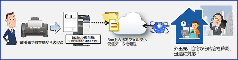 コニカミノルタジャパンのファクス電子化ソリューションは、受信と同時にデータのままクラウドに転送保存し、担当者にメールでお知らせ。ノートPCやタブレットからの確認と返信で、いつでもどこからでもファクス対応が可能になります。