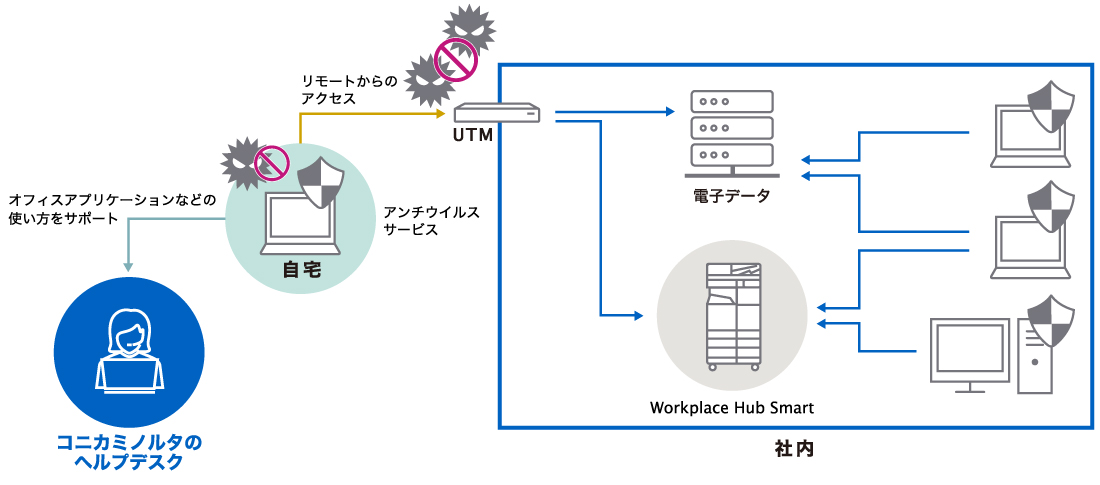 テレワークなど新たな働き方への対応を進めるため、それに対応したITインフラの整備や管理が必要となっています。ウイルスの脅威から保護することや不正アクセスの防止など働き方が変わることでより強化する必要があります。コニカミノルタでは日々進化するセキュリティーリスクを軽減するソリューション提供をします。