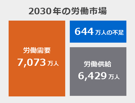 今後人口減少に伴い、ますます労働人口の減少は進むことが予測されており、2030年には644万人が不足すると言われています。