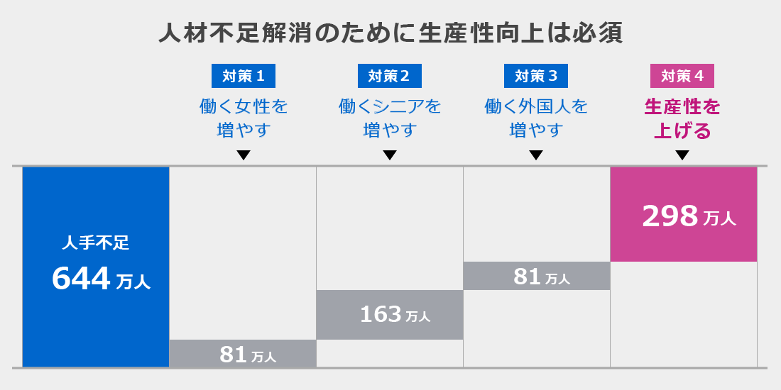 働き手確保のため、女性の働く環境整備やシニア、外国人労働者の雇用など様々な施策は検討されていますが、それでも約300万人分の人手は不足すると推定されており、「生産性を上げる」ことが最も効果が大きく、とりわけ「デジタルを活用した生産性の向上が重要」となります。