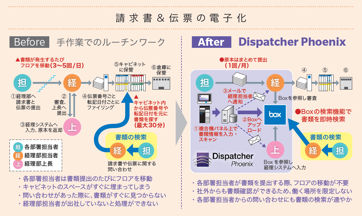 提出の方法もバラバラであったため、紙書類の電子化、文書管理の効率化を実現するタスクオートメーションツール「Dispatcher Phoenix」を活用し部門からの提出方法を統一。提出者は複合機に読み込ませることで提出が完了、経理処理や保管もデータを利用して行えるためスムーズに行えるようになりました。