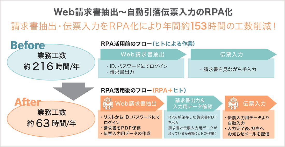 各種受発注など、業務処理全般を行っている業務統括センターでは、時間のかかっている業務としてWeb請求書からの抽出と伝票への入力作業がありました。宅急便や電力会社のホームページから請求書をダウンロード、伝票入力、支払いが、毎月100件以上の処理が発生。たとえ請求書が発生しなくとも会社ごとに請求書をWeb経由で確認をする必要があります。月末締めの確認作業は非常に手間がかかり、年間にすると5人の スタッフが216時間をかけてこの業務を行っている状況でした。