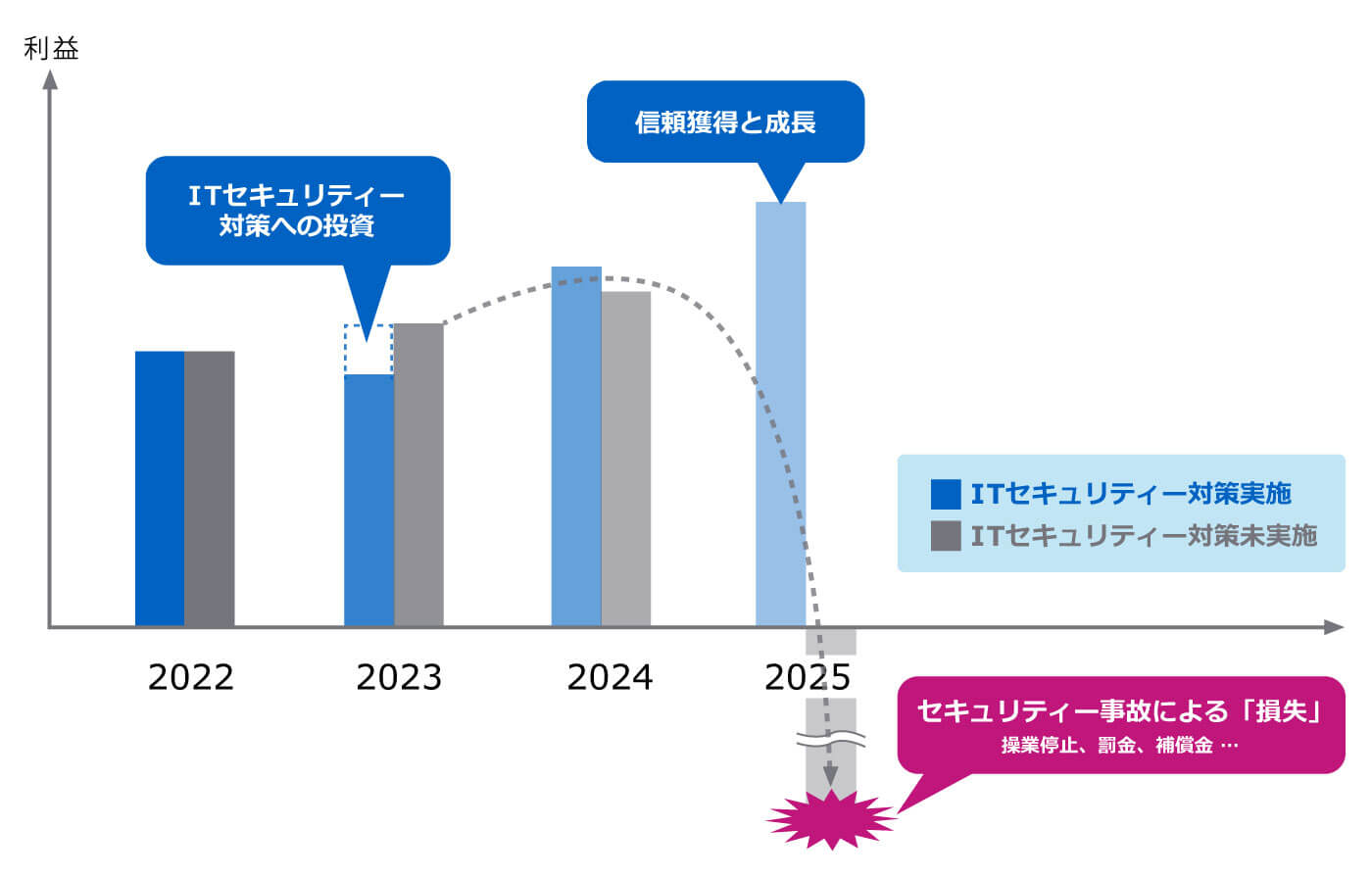 「ITセキュリティー対策」と聞くと、経営者の方々の中には「通常の事業活動での必要経費に加えて追加でかかるコスト」として捉えてしまう方がいます。確かに出費を抑制すれば当期の利益が保たれるように見えますが、今後は対策ができていない企業への発注を抑える依頼主は増えていくでしょうし、いざ犯罪や事故に巻き込まれれば巨額の損失が発生します。そうなってからの対策ではもう遅いのです。