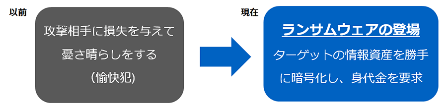 かつてのコンピューターウイルスは、見えない相手に損害を与え、特定のウイルス名がその損害と共にニュースで報じられるのを聞いて高揚感に浸るという、いわば憂さ晴らしが目的の愉快犯の特色が強いものでした。