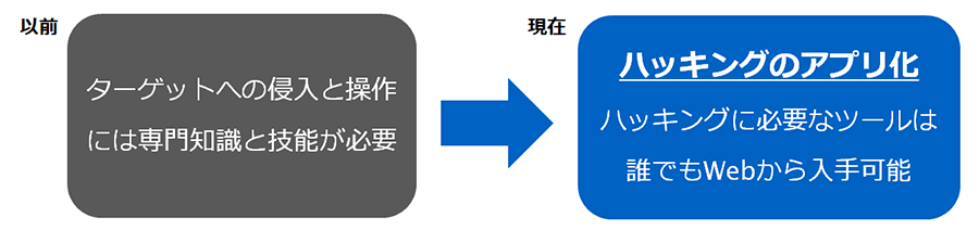 以前ハッキングといえば、特殊な専門知識を持ったハッカーによって行われるイメージがありました。企業や政府のネットワークに侵入するために特殊なコマンド操作を行い、裏口を空けるような手口を思い浮かべたかと思います。しかし今では、使い方によっては他者の通信機器の空いているポートをスキャンしたり、Wi-Fiの暗号通信の解読を可能にしたりするようなアプリが出回っており、攻撃する意欲さえあればほぼ誰でもスキルレスで実行できるようになりました。