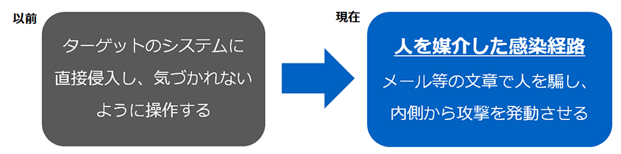 以前のインターネット社会において、ハッカーがターゲットとしていたのはシステムでした。いかにシステム設計の脆弱性を突いて、そこから侵入し、気付かれないように情報の窃取や改ざんを行うかということがハッカーの腕前にかかっていました。しかし今やハッカーに狙われているのはシステムではなく、インターネットの利用者である我々です。本物そっくりの偽メールやWebサイトを作り、いかに受信者を騙して不正なプログラムを発動してもらうか、ということがハッキング能力の優劣を決めます。インターネットユーザーや利用シーンが爆発的に増えたことで、そのような手口の有効性も増したと考えられます。