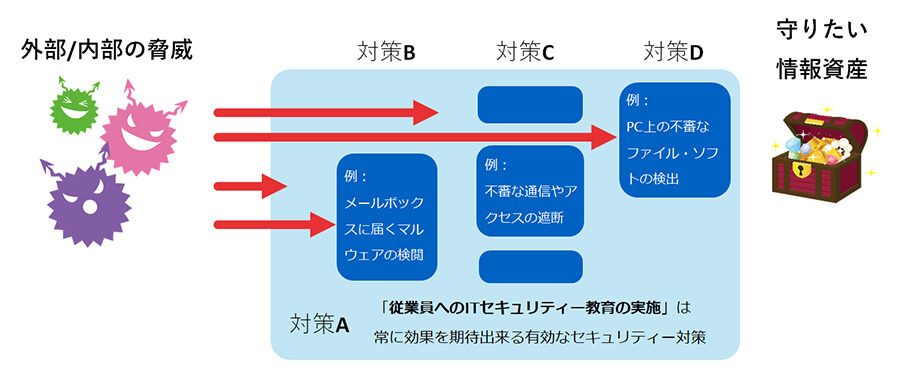 先ほどの説明にもあるように、近年の侵入経路や手口は巧妙で、今この瞬間にもサイバー犯罪の犯人たちは新たな手口を開発していることでしょう。未知のリスクにも対応していくために、下図のように様々な事態を想定した「多層防御」の考え方が必要です。また、企業内で既にインストール済みのアンチウイルスや設置済みのファイアウォールなどは、導入時はよく選定して最新型を入れたとしても、日々アップデートされていく「脅威」の側から見れば、それらの抵抗能力は徐々に時代遅れの弱いものとなっていきます。