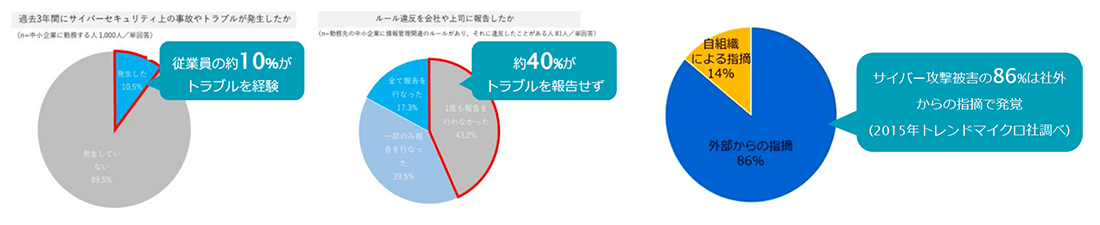 また、従業員がウイルスメールの開封などのトラブルに遭遇した場合も、その4割が上司やセキュリティーの担当への報告をせずにいるという調査結果もあります。「報告をすると面倒なことになる」のが報告を躊躇する理由かも知れません。企業としての警戒意識が低いことでサイバー攻撃の発覚を遅らせ、被害を拡大させることにつながりかねません。