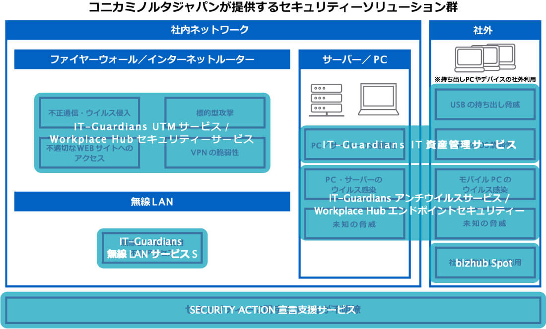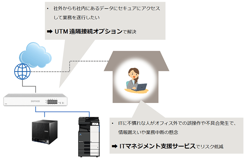 例えばPCの不調や故障時の対応(マネージドPCサービス)や、使い方の問い合わせ(ITサポートサービス)、Wi-Fi認証ユーザーのID管理(無線LANサービスS+アクセス認証クラウド)など、企業内の従業員が遭遇する様々な用件にコニカミノルタジャパンのスタッフがお客様のIT担当窓口となり、リモートでお応えします。また、新たな脅威に対応する為の、UTMやアンチウイルスソフトのアップデート管理もお引き受けします。