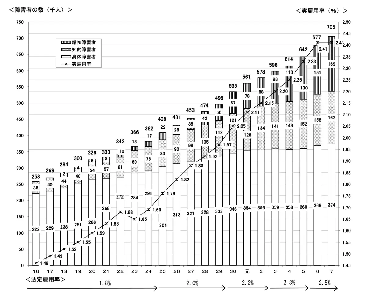 表1 出所:令和7年 障害者雇用状況の集計結果(厚生労働省)R7.12月:https://www.mhlw.go.jp/content/11704000/001357856.pdf